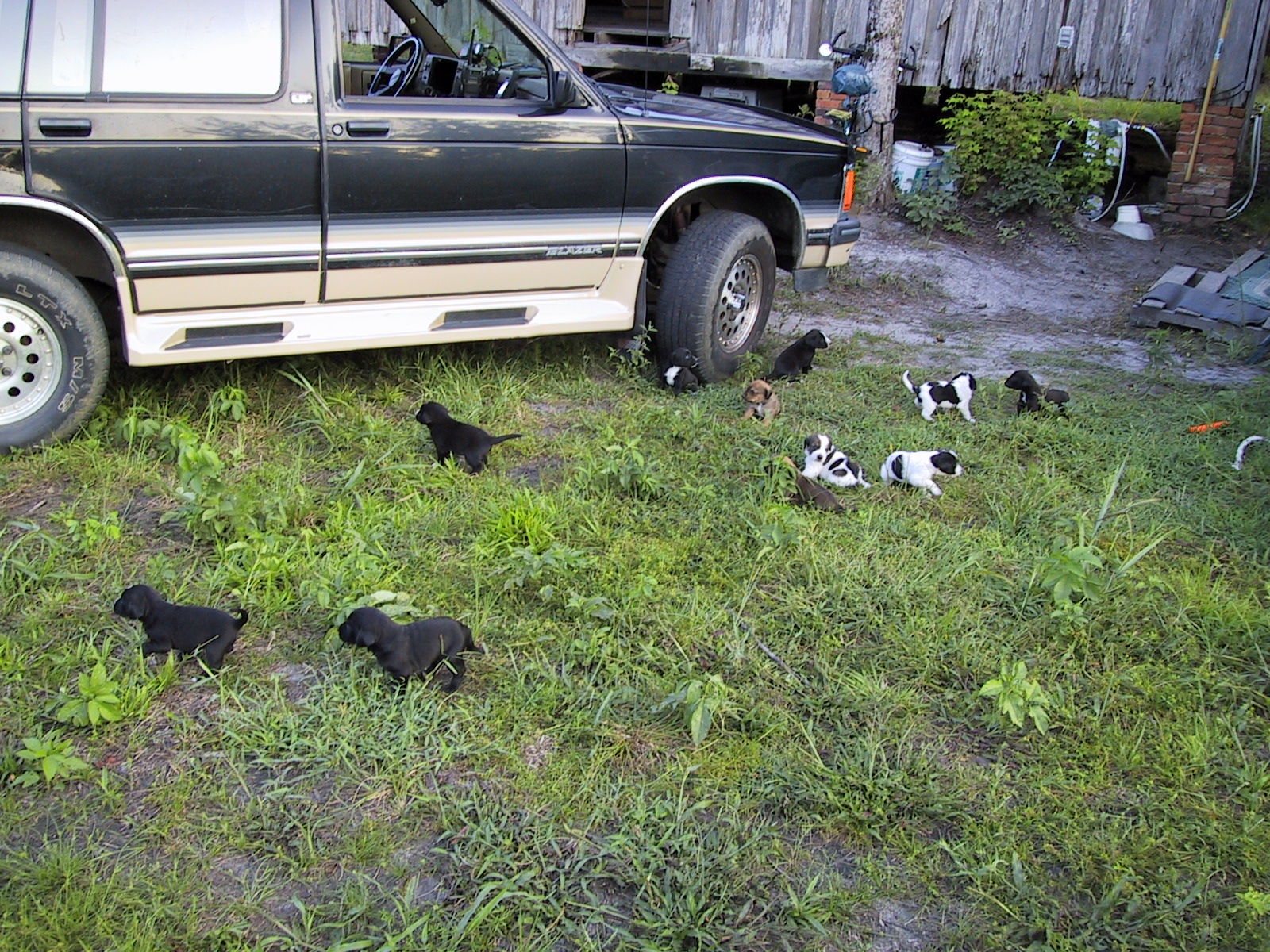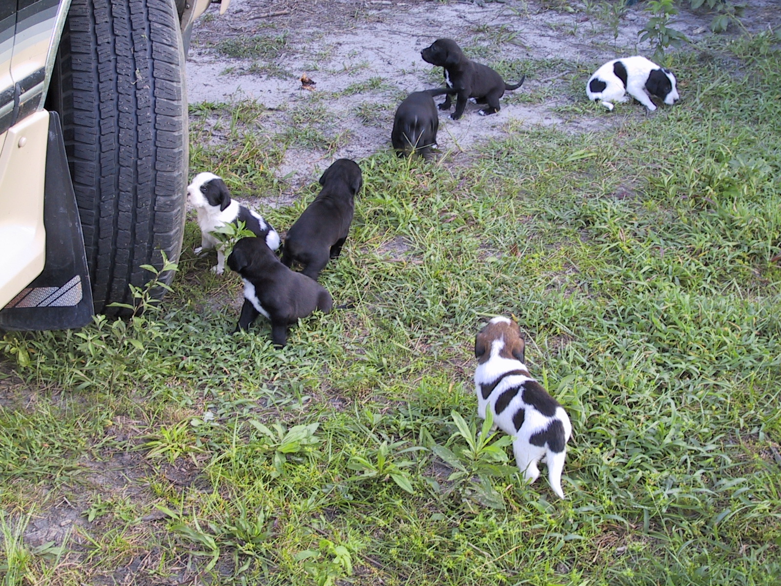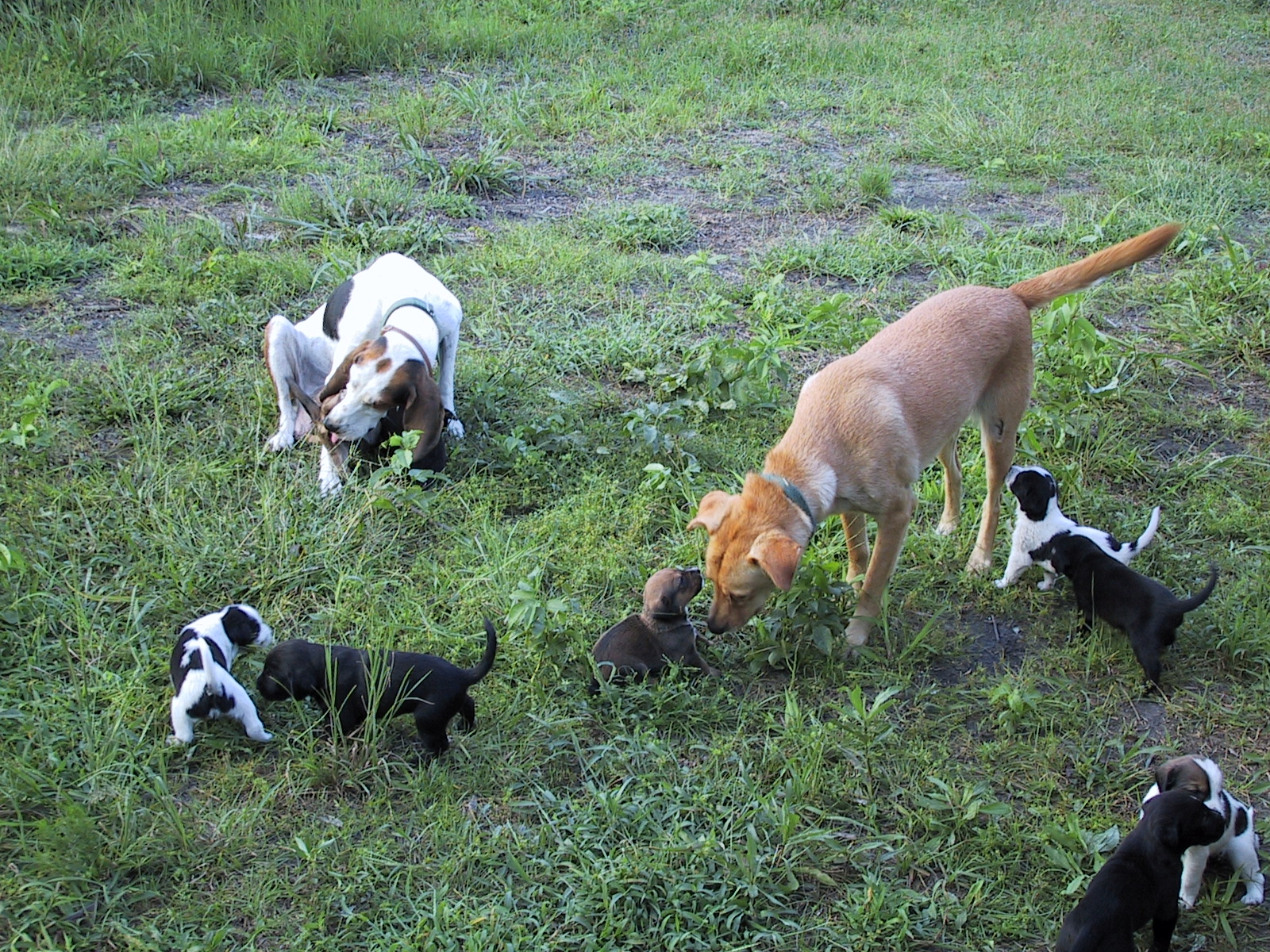 What I didn't realize was that Queenie hadn't been neutered. Then one day, summer of '01, I woke up to a yard full of male dogs, all seeking Queenie's amorous attentions.